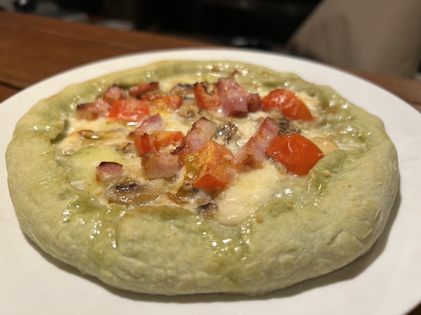 ほうれん草風味の生地から仕込み、マッシュルーム、ミニトマト、ベーコン、燻製モッツァレラチーズをトッピングし、耳には何とゴルゴンゾーラを巻き込み、究極の味変を可能にします。