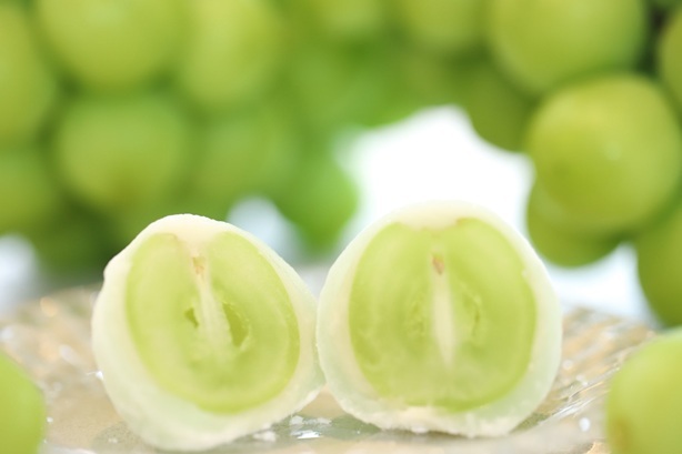 こちらもお店で大人気の季節の和菓子、大粒シャインマスカットを使用した「大粒シャインマスカット大福」。甘く爽やかでジューシーなシャインマスカットをお餅で包んだ超贅沢な一品。