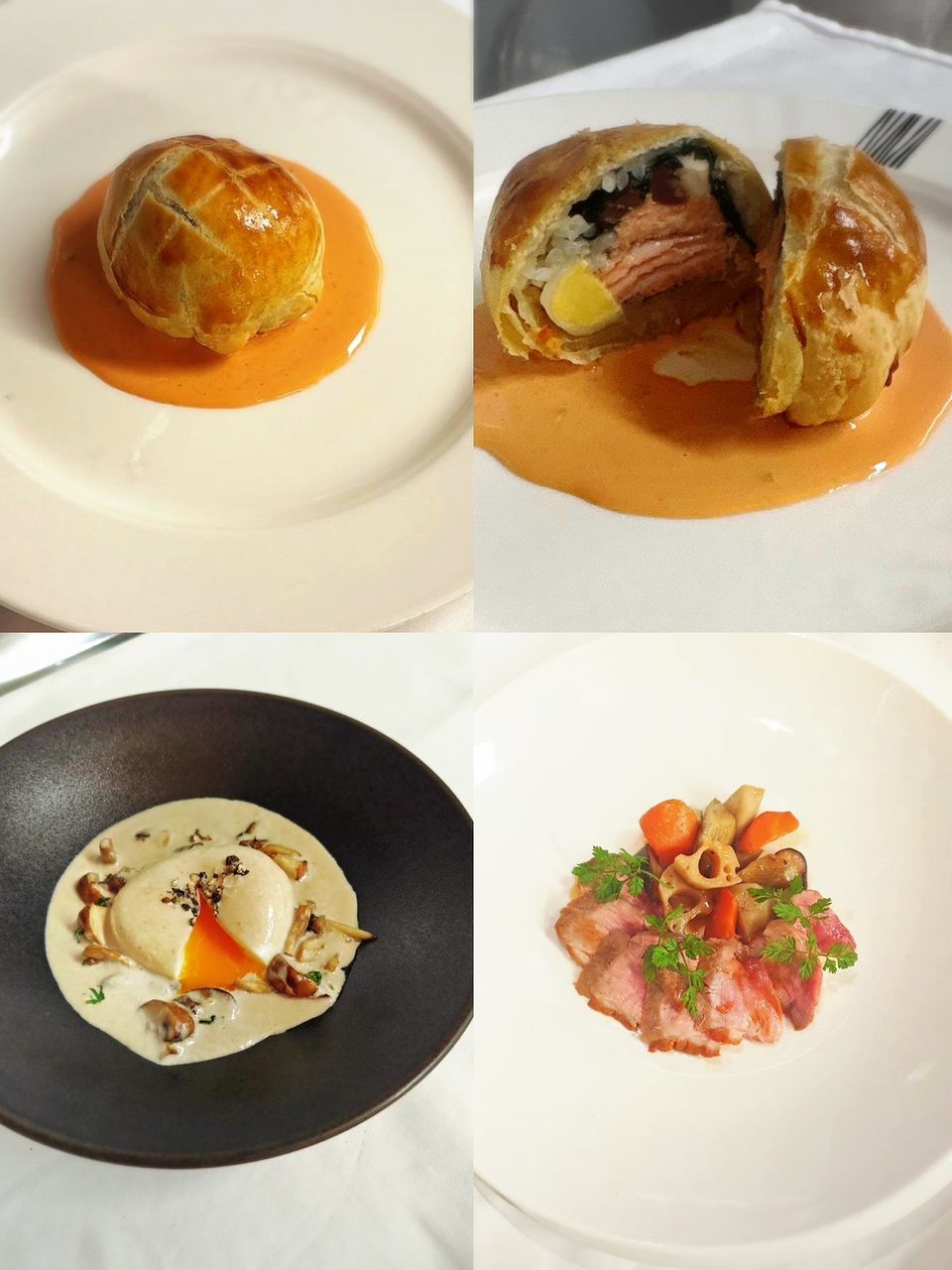1.半熟卵とキノコのブイヨン2.サーモンのパイ包み クーリビアック風