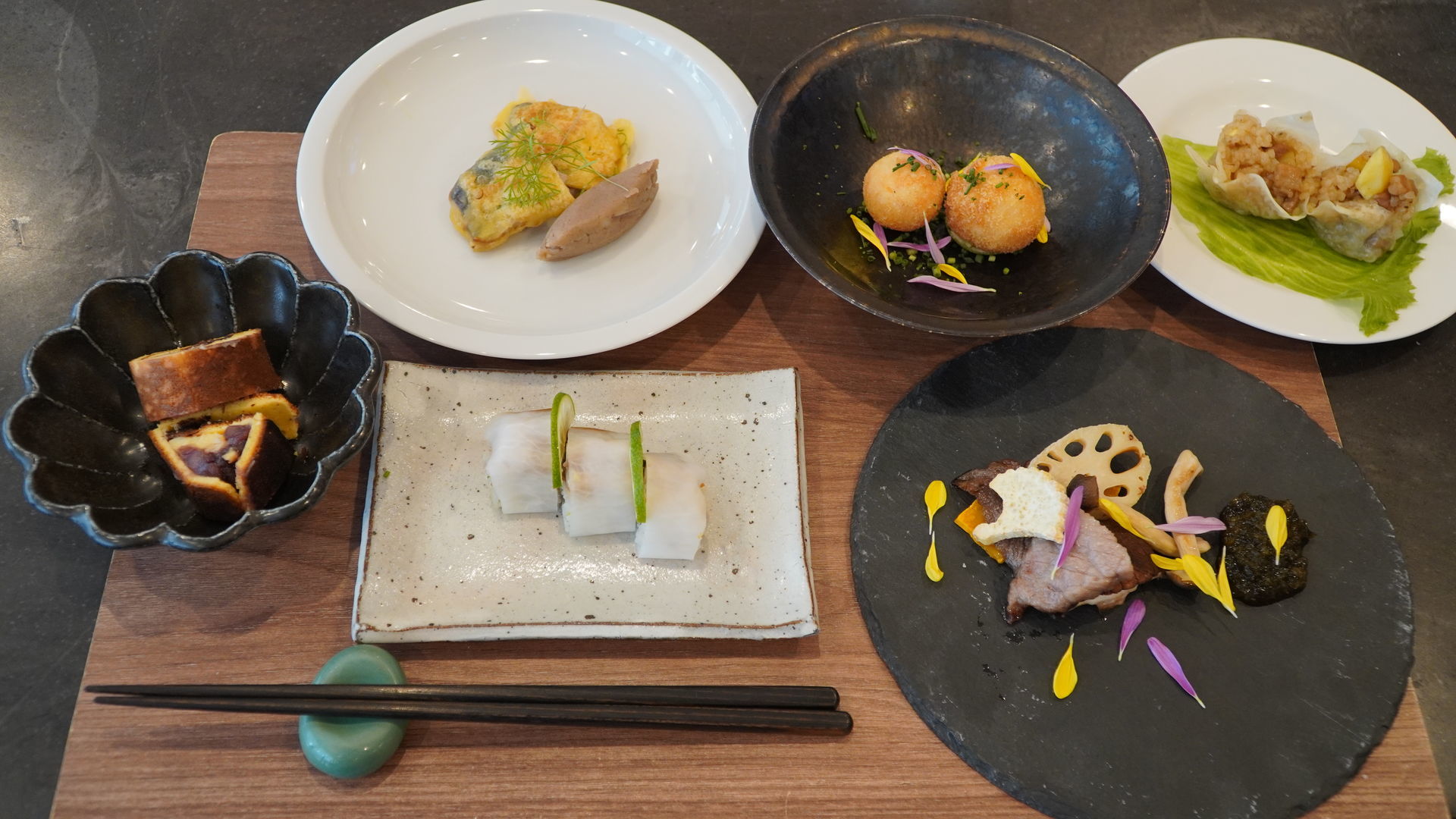 満田シェフから、季節の日本料理を学びます。グループで5~7種類の料理を仕上げるスタイルで、お店で提供されるようなメニューを協力して作り上げます。